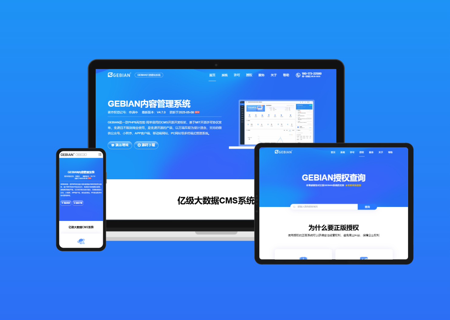 GEBIAN内容管理系统是一款基于PHP8的高性能、简单易用的CMS开源开发框架。它基于MIT开源许可协议发布,免费且不限制商业使用。以万端互联为设计理念,支持多终端管理。该系统具备亿级大数据处理能力,速度快性能高,有分布式设计及分表存储技